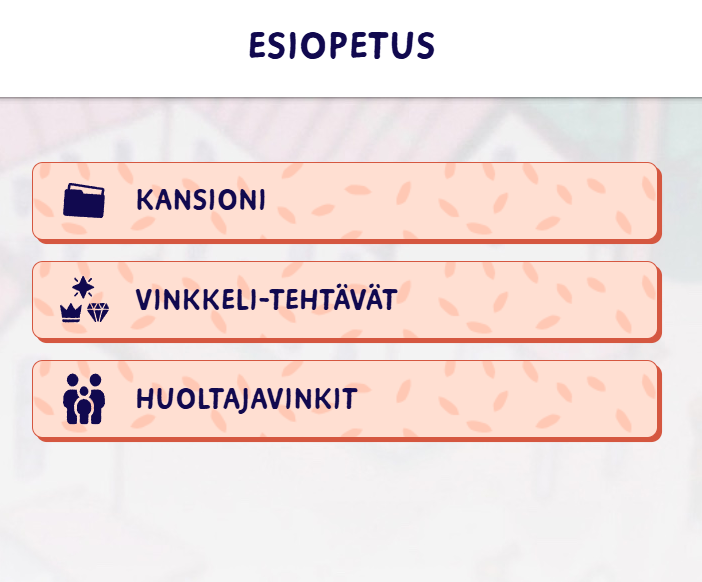 Korttia klikkaamalla pääsee tarkastelemaan erilaisia osiota ja tutkimaan niiden sisältöjä. Huoltajan käyttöliittymä on ns. passiivinen käyttöliittymä eli siellä voi ainoastaan seurata lapsen edistymistä, tarkastella tämän suorituksia ja antaa kannustavaa palautetta, mutta tehtäviä ei pääse tekemään huoltajan tunnuksella.